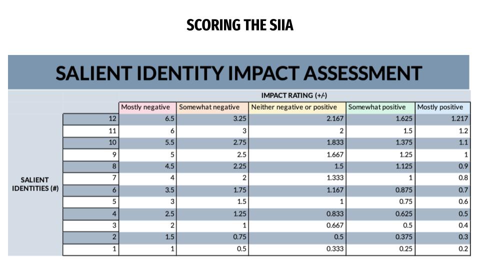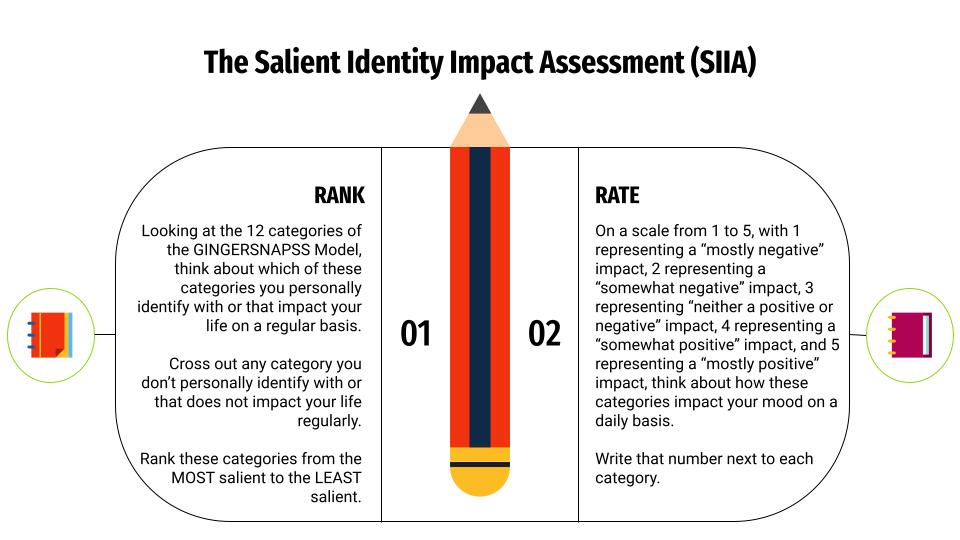 The Salient Identity Impact Assessment (SIIA) is intended for counselors to measure the client’s impact of their salient identities on daily life, analyzing their positive or negative influences. Salience, in this context, is defined as an acute awareness of cultural identities that impact daily life and carry some degree of significance. This assessment can inform decisions about where to focus therapeutic energy and how to best gear sessions towards desired goals.